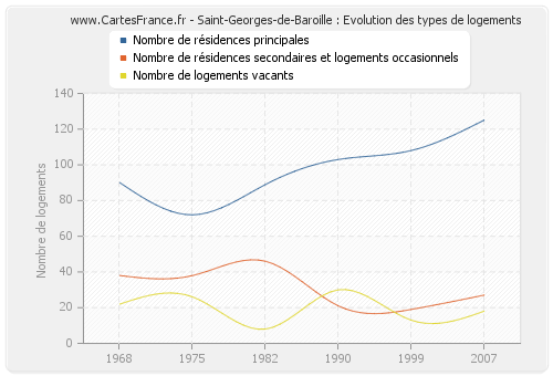 Le nombre de logements de Saint-Georges-de-Baroille était de 170 en 2007, 140 en 1999, 154 en 1990, 143 en 1982, 136 en 1975 et 150 en 1968.