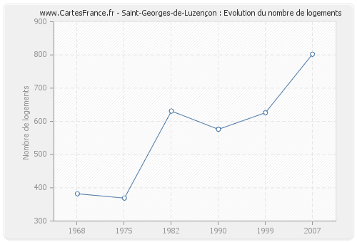 Les graphiques suivant reprennent l'historique du nombre et du type de logements de Saint-Georges-de-Luzençon de 1968 à 2007. Le deuxième graphique est tracé en interpolation cubique. Ceci permet d'obtenir plus précisément le nombre de logement du village de Saint-Georges-de-Luzençon les années ou aucun recensement n'a été effectué.
