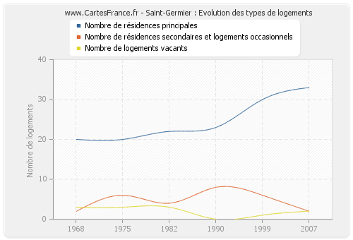 Les graphiques suivant reprennent l'historique du nombre et du type de logements de Saint-Germier de 1968 à 2007. Le deuxième graphique est tracé en interpolation cubique. Ceci permet d'obtenir plus précisément le nombre de logement du village de Saint-Germier les années ou aucun recensement n'a été effectué.