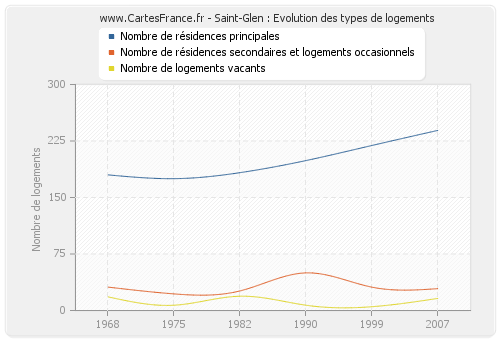 Les graphiques suivant reprennent l'historique du nombre et du type de logements de Saint-Glen de 1968 à 2007. Le deuxième graphique est tracé en interpolation cubique. Ceci permet d'obtenir plus précisément le nombre de logement du village de Saint-Glen les années ou aucun recensement n'a été effectué.