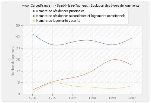 Les graphiques suivant reprennent l'historique du nombre et du type de logements de Saint-Hilaire-Taurieux de 1968 à 2007. Le deuxième graphique est tracé en interpolation cubique. Ceci permet d'obtenir plus précisément le nombre de logement du village de Saint-Hilaire-Taurieux les années ou aucun recensement n'a été effectué.