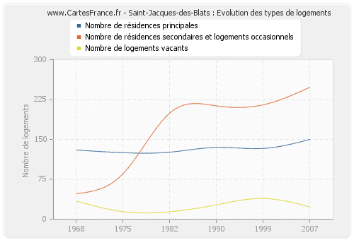 Les graphiques suivant reprennent l'historique du nombre et du type de logements de Saint-Jacques-des-Blats de 1968 à 2007. Le deuxième graphique est tracé en interpolation cubique. Ceci permet d'obtenir plus précisément le nombre de logement du village de Saint-Jacques-des-Blats les années ou aucun recensement n'a été effectué.