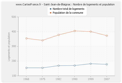 La population de Saint-Jean-de-Blaignac était de 373 habitants en 2007, 401 habitants en 1999, 405 habitants en 1990, 378 habitants en 1982, 341 habitants en 1975 et 354 habitants en 1968. Parallèlement, le nombre de logements de Saint-Jean-de-Blaignac était de 178 en 2007, 182 en 1999, 170 en 1990, 169 en 1982, 154 en 1975 et 154 en 1968.