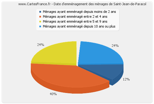 - Nombre de ménages de Saint-Jean-de-Paracol ayant emménagé depuis 10 ans ou plus : 12
