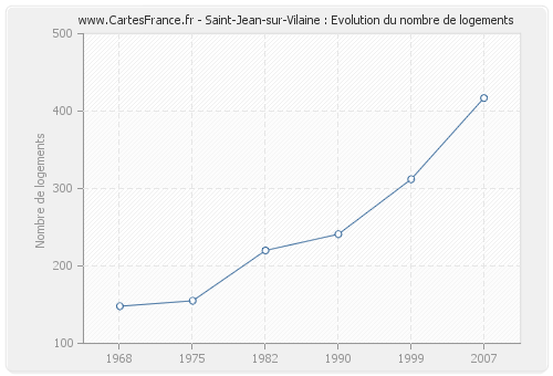 Les graphiques suivant reprennent l'historique du nombre et du type de logements de Saint-Jean-sur-Vilaine de 1968 à 2007. Le deuxième graphique est tracé en interpolation cubique. Ceci permet d'obtenir plus précisément le nombre de logement du village de Saint-Jean-sur-Vilaine les années ou aucun recensement n'a été effectué.