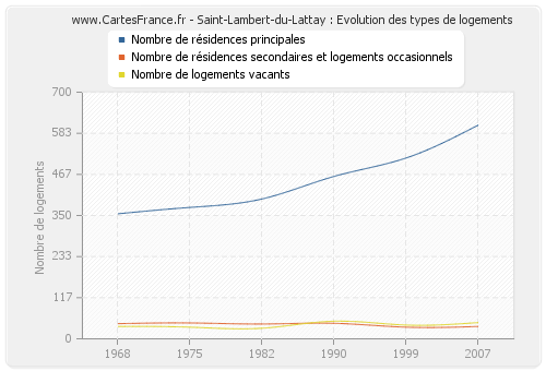Les graphiques suivant reprennent l'historique du nombre et du type de logements de Saint-Lambert-du-Lattay de 1968 à 2007. Le deuxième graphique est tracé en interpolation cubique. Ceci permet d'obtenir plus précisément le nombre de logement du village de Saint-Lambert-du-Lattay les années ou aucun recensement n'a été effectué.