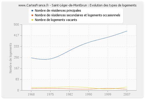 Les graphiques suivant reprennent l'historique du nombre et du type de logements de Saint-Léger-de-Montbrun de 1968 à 2007. Le deuxième graphique est tracé en interpolation cubique. Ceci permet d'obtenir plus précisément le nombre de logement du village de Saint-Léger-de-Montbrun les années ou aucun recensement n'a été effectué.