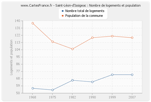 La population de Saint-Léon-d'Issigeac était de 119 habitants en 2007, 121 habitants en 1999, 119 habitants en 1990, 105 habitants en 1982, 114 habitants en 1975 et 137 habitants en 1968. Parallèlement, le nombre de logements de Saint-Léon-d'Issigeac était de 73 en 2007, 73 en 1999, 64 en 1990, 66 en 1982, 54 en 1975 et 56 en 1968.