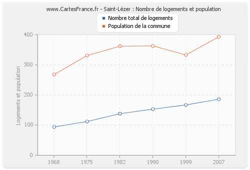 La population de Saint-Lézer était de 393 habitants en 2007, 333 habitants en 1999, 363 habitants en 1990, 362 habitants en 1982, 331 habitants en 1975 et 268 habitants en 1968. Parallèlement, le nombre de logements de Saint-Lézer était de 186 en 2007, 167 en 1999, 153 en 1990, 138 en 1982, 112 en 1975 et 94 en 1968.