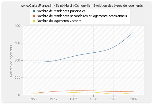 Les graphiques suivant reprennent l'historique du nombre et du type de logements de Saint-Martin-Osmonville de 1968 à 2007. Le deuxième graphique est tracé en interpolation cubique. Ceci permet d'obtenir plus précisément le nombre de logement du village de Saint-Martin-Osmonville les années ou aucun recensement n'a été effectué.