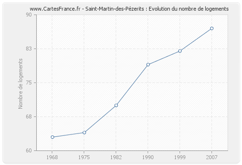 Le nombre de logements de Saint-Martin-des-Pézerits était de 87 en 2007, 82 en 1999, 79 en 1990, 70 en 1982, 64 en 1975 et 63 en 1968.