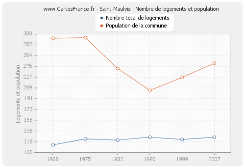 La population de Saint-Maulvis était de 251 habitants en 2007, 227 habitants en 1999, 205 habitants en 1990, 242 habitants en 1982, 294 habitants en 1975 et 293 habitants en 1968. Parallèlement, le nombre de logements de Saint-Maulvis était de 126 en 2007, 122 en 1999, 126 en 1990, 121 en 1982, 123 en 1975 et 113 en 1968.