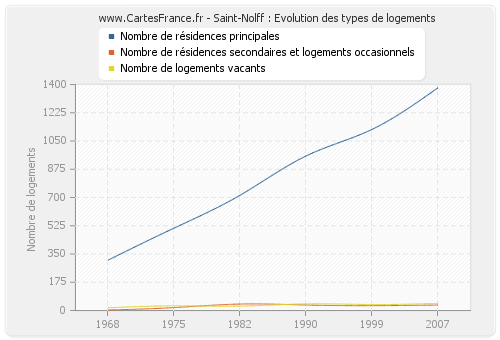 Les graphiques suivant reprennent l'historique du nombre et du type de logements de Saint-Nolff de 1968 à 2007. Le deuxième graphique est tracé en interpolation cubique. Ceci permet d'obtenir plus précisément le nombre de logement de la ville de Saint-Nolff les années ou aucun recensement n'a été effectué.