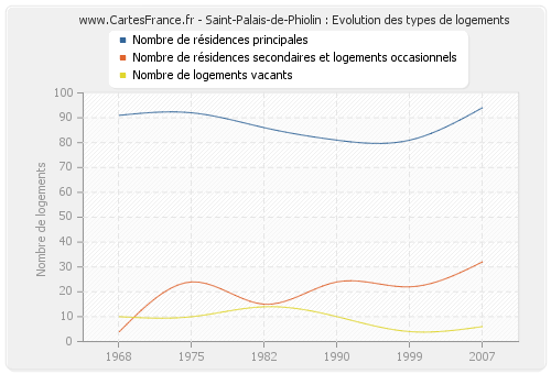 Les graphiques suivant reprennent l'historique du nombre et du type de logements de Saint-Palais-de-Phiolin de 1968 à 2007. Le deuxième graphique est tracé en interpolation cubique. Ceci permet d'obtenir plus précisément le nombre de logement du village de Saint-Palais-de-Phiolin les années ou aucun recensement n'a été effectué.