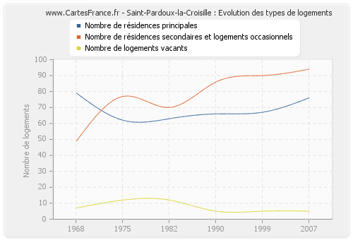 Les graphiques suivant reprennent l'historique du nombre et du type de logements de Saint-Pardoux-la-Croisille de 1968 à 2007. Le deuxième graphique est tracé en interpolation cubique. Ceci permet d'obtenir plus précisément le nombre de logement du village de Saint-Pardoux-la-Croisille les années ou aucun recensement n'a été effectué.