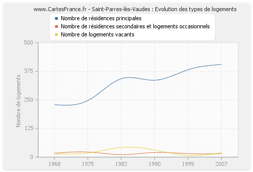 Les graphiques suivant reprennent l'historique du nombre et du type de logements de Saint-Parres-lès-Vaudes de 1968 à 2007. Le deuxième graphique est tracé en interpolation cubique. Ceci permet d'obtenir plus précisément le nombre de logement du village de Saint-Parres-lès-Vaudes les années ou aucun recensement n'a été effectué.