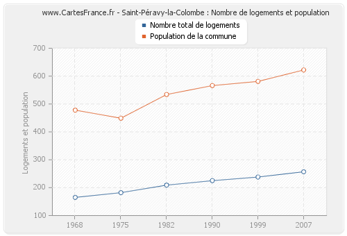 La population de Saint-Péravy-la-Colombe était de 622 habitants en 2007, 581 habitants en 1999, 566 habitants en 1990, 534 habitants en 1982, 449 habitants en 1975 et 478 habitants en 1968. Parallèlement, le nombre de logements de Saint-Péravy-la-Colombe était de 257 en 2007, 238 en 1999, 225 en 1990, 209 en 1982, 182 en 1975 et 165 en 1968.