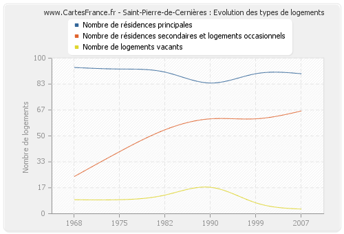 Les graphiques suivant reprennent l'historique du nombre et du type de logements de Saint-Pierre-de-Cernières de 1968 à 2007. Le deuxième graphique est tracé en interpolation cubique. Ceci permet d'obtenir plus précisément le nombre de logement du village de Saint-Pierre-de-Cernières les années ou aucun recensement n'a été effectué.