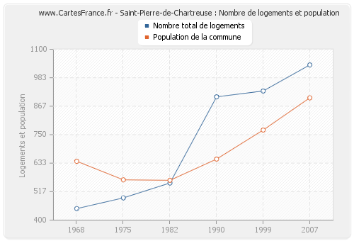 La population de Saint-Pierre-de-Chartreuse était de 901 habitants en 2007, 769 habitants en 1999, 650 habitants en 1990, 563 habitants en 1982, 565 habitants en 1975 et 641 habitants en 1968. Parallèlement, le nombre de logements de Saint-Pierre-de-Chartreuse était de 1 036 en 2007, 929 en 1999, 905 en 1990, 552 en 1982, 491 en 1975 et 447 en 1968.