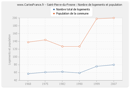 La population de Saint-Pierre-du-Fresne était de 200 habitants en 2007, 198 habitants en 1999, 127 habitants en 1990, 127 habitants en 1982, 144 habitants en 1975 et 138 habitants en 1968. Parallèlement, le nombre de logements de Saint-Pierre-du-Fresne était de 80 en 2007, 76 en 1999, 59 en 1990, 62 en 1982, 61 en 1975 et 57 en 1968.