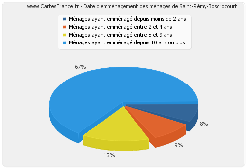 - Nombre de ménages de Saint-Rémy-Boscrocourt ayant emménagé depuis 10 ans ou plus : 187