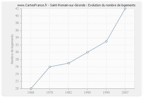 Le nombre de logements de Saint-Romain-sur-Gironde était de 42 en 2007, 33 en 1999, 30 en 1990, 27 en 1982, 26 en 1975 et 20 en 1968.