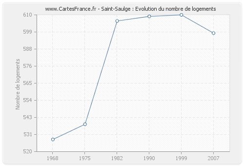 Le nombre de logements de Saint-Saulge était de 598 en 2007, 610 en 1999, 609 en 1990, 606 en 1982, 538 en 1975 et 528 en 1968.