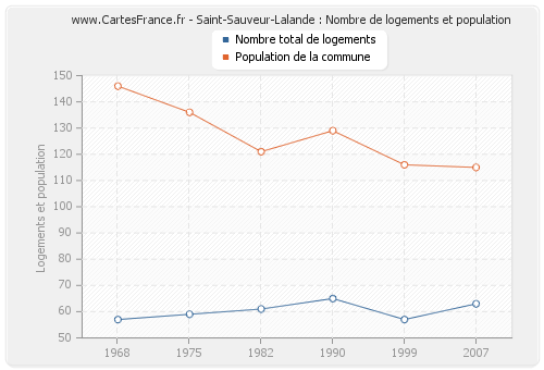 La population de Saint-Sauveur-Lalande était de 115 habitants en 2007, 116 habitants en 1999, 129 habitants en 1990, 121 habitants en 1982, 136 habitants en 1975 et 146 habitants en 1968. Parallèlement, le nombre de logements de Saint-Sauveur-Lalande était de 63 en 2007, 57 en 1999, 65 en 1990, 61 en 1982, 59 en 1975 et 57 en 1968.
