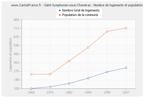 La population de Saint-Symphorien-sous-Chomérac était de 716 habitants en 2007, 682 habitants en 1999, 519 habitants en 1990, 381 habitants en 1982, 247 habitants en 1975 et 246 habitants en 1968. Parallèlement, le nombre de logements de Saint-Symphorien-sous-Chomérac était de 312 en 2007, 270 en 1999, 206 en 1990, 152 en 1982, 119 en 1975 et 101 en 1968.