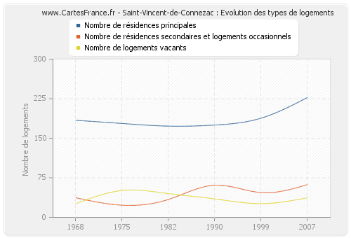 Les graphiques suivant reprennent l'historique du nombre et du type de logements de Saint-Vincent-de-Connezac de 1968 à 2007. Le deuxième graphique est tracé en interpolation cubique. Ceci permet d'obtenir plus précisément le nombre de logement du village de Saint-Vincent-de-Connezac les années ou aucun recensement n'a été effectué.