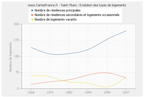 Les graphiques suivant reprennent l'historique du nombre et du type de logements de Saint-Ybars de 1968 à 2007. Le deuxième graphique est tracé en interpolation cubique. Ceci permet d'obtenir plus précisément le nombre de logement du village de Saint-Ybars les années ou aucun recensement n'a été effectué.