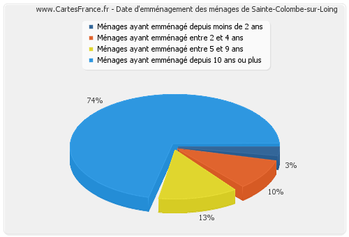 - Nombre de ménages de Sainte-Colombe-sur-Loing ayant emménagé depuis 10 ans ou plus : 74