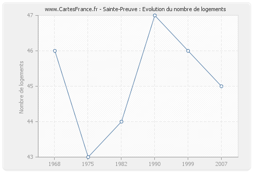 Le nombre de logements de Sainte-Preuve était de 45 en 2007, 46 en 1999, 47 en 1990, 44 en 1982, 43 en 1975 et 46 en 1968.