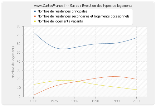 Les graphiques suivant reprennent l'historique du nombre et du type de logements de Saires de 1968 à 2007. Le deuxième graphique est tracé en interpolation cubique. Ceci permet d'obtenir plus précisément le nombre de logement du village de Saires les années ou aucun recensement n'a été effectué.