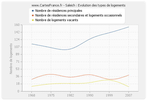 Les graphiques suivant reprennent l'historique du nombre et du type de logements de Saleich de 1968 à 2007. Le deuxième graphique est tracé en interpolation cubique. Ceci permet d'obtenir plus précisément le nombre de logement du village de Saleich les années ou aucun recensement n'a été effectué.