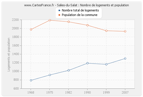 La population de Salies-du-Salat était de 1 932 habitants en 2007, 1 946 habitants en 1999, 2 074 habitants en 1990, 2 154 habitants en 1982, 2 191 habitants en 1975 et 1 975 habitants en 1968. Parallèlement, le nombre de logements de Salies-du-Salat était de 1 300 en 2007, 1 164 en 1999, 1 190 en 1990, 1 024 en 1982, 917 en 1975 et 792 en 1968.