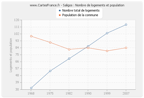 Historique du nombre de logements de Saligos de 1968 à 2007 :