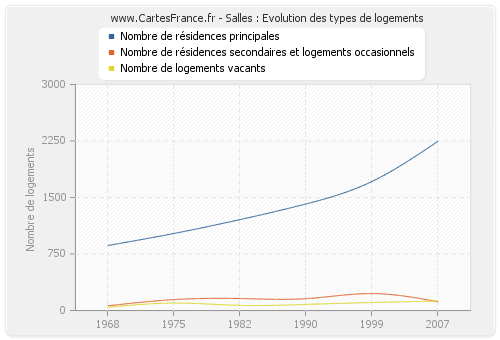 Les graphiques suivant reprennent l'historique du nombre et du type de logements de Salles de 1968 à 2007. Le deuxième graphique est tracé en interpolation cubique. Ceci permet d'obtenir plus précisément le nombre de logement de la ville de Salles les années ou aucun recensement n'a été effectué.