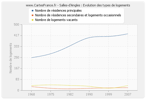 Les graphiques suivant reprennent l'historique du nombre et du type de logements de Salles-d'Angles de 1968 à 2007. Le deuxième graphique est tracé en interpolation cubique. Ceci permet d'obtenir plus précisément le nombre de logement du village de Salles-d'Angles les années ou aucun recensement n'a été effectué.