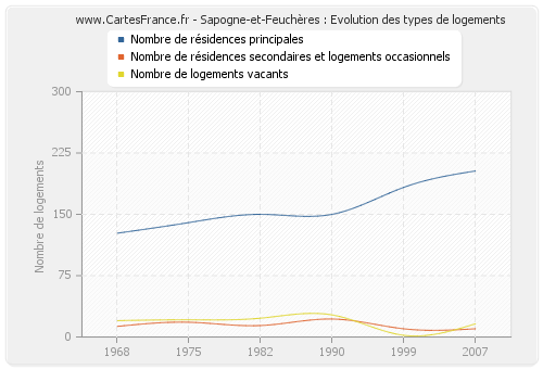 Les graphiques suivant reprennent l'historique du nombre et du type de logements de Sapogne-et-Feuchères de 1968 à 2007. Le deuxième graphique est tracé en interpolation cubique. Ceci permet d'obtenir plus précisément le nombre de logement du village de Sapogne-et-Feuchères les années ou aucun recensement n'a été effectué.