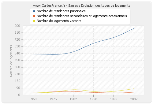 Les graphiques suivant reprennent l'historique du nombre et du type de logements de Sarras de 1968 à 2007. Le deuxième graphique est tracé en interpolation cubique. Ceci permet d'obtenir plus précisément le nombre de logement de la ville de Sarras les années ou aucun recensement n'a été effectué.