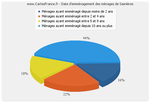 - Nombre de ménages de Sasnières ayant emménagé depuis 10 ans ou plus : 20