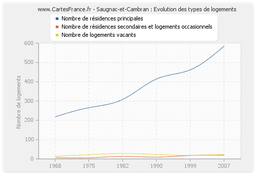 Les graphiques suivant reprennent l'historique du nombre et du type de logements de Saugnac-et-Cambran de 1968 à 2007. Le deuxième graphique est tracé en interpolation cubique. Ceci permet d'obtenir plus précisément le nombre de logement du village de Saugnac-et-Cambran les années ou aucun recensement n'a été effectué.