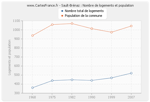 La population de Sault-Brénaz était de 1 043 habitants en 2007, 974 habitants en 1999, 1 014 habitants en 1990, 1 070 habitants en 1982, 1 059 habitants en 1975 et 937 habitants en 1968. Parallèlement, le nombre de logements de Sault-Brénaz était de 521 en 2007, 469 en 1999, 441 en 1990, 448 en 1982, 439 en 1975 et 360 en 1968.