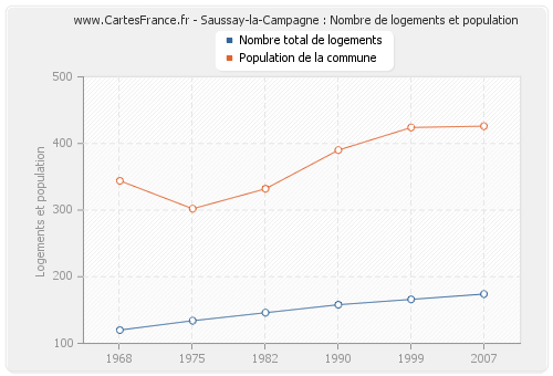 La population de Saussay-la-Campagne était de 426 habitants en 2007, 424 habitants en 1999, 390 habitants en 1990, 332 habitants en 1982, 302 habitants en 1975 et 344 habitants en 1968. Parallèlement, le nombre de logements de Saussay-la-Campagne était de 174 en 2007, 166 en 1999, 158 en 1990, 146 en 1982, 134 en 1975 et 120 en 1968.