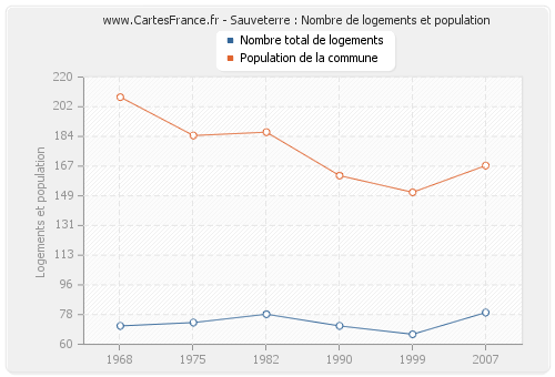 La population de Sauveterre était de 167 habitants en 2007, 151 habitants en 1999, 161 habitants en 1990, 187 habitants en 1982, 185 habitants en 1975 et 208 habitants en 1968. Parallèlement, le nombre de logements de Sauveterre était de 79 en 2007, 66 en 1999, 71 en 1990, 78 en 1982, 73 en 1975 et 71 en 1968.