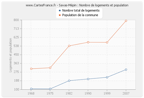 La population de Savas-Mépin était de 793 habitants en 2007, 575 habitants en 1999, 576 habitants en 1990, 540 habitants en 1982, 319 habitants en 1975 et 309 habitants en 1968. Parallèlement, le nombre de logements de Savas-Mépin était de 301 en 2007, 223 en 1999, 206 en 1990, 189 en 1982, 106 en 1975 et 107 en 1968.