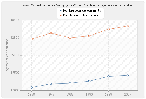 La population de Savigny-sur-Orge était de 37 469 habitants en 2007, 36 219 habitants en 1999, 33 295 habitants en 1990, 32 502 habitants en 1982, 34 478 habitants en 1975 et 31 956 habitants en 1968. Parallèlement, le nombre de logements de Savigny-sur-Orge était de 16 438 en 2007, 15 964 en 1999, 13 967 en 1990, 13 112 en 1982, 12 806 en 1975 et 11 249 en 1968.