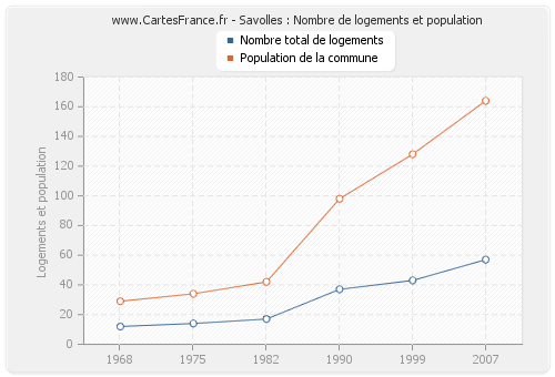 La population de Savolles était de 164 habitants en 2007, 128 habitants en 1999, 98 habitants en 1990, 42 habitants en 1982, 34 habitants en 1975 et 29 habitants en 1968. Parallèlement, le nombre de logements de Savolles était de 57 en 2007, 43 en 1999, 37 en 1990, 17 en 1982, 14 en 1975 et 12 en 1968.