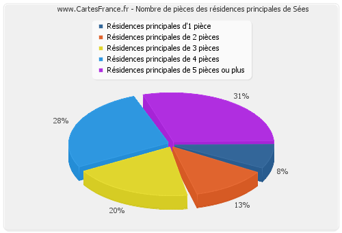 La Ville de Sées recensait la même année un total de 1 978 ménages. Les graphiques suivants présentent les statistiques d'habitation de ces ménages de Sées.